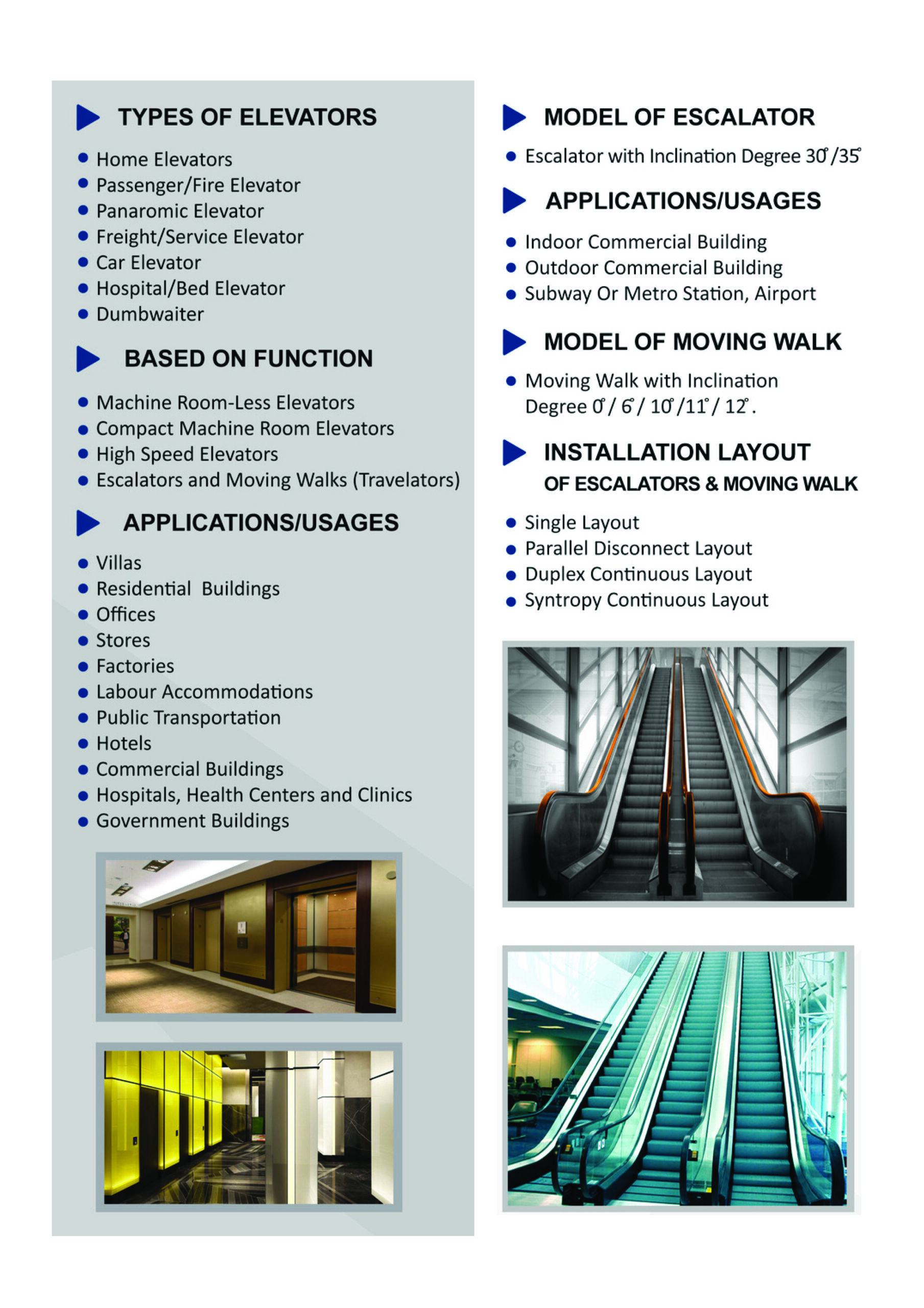 home elevators, hospital elevators, freight elevators, and escalators.