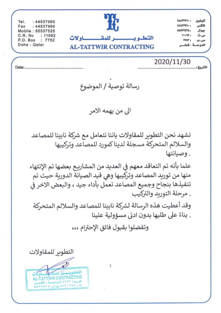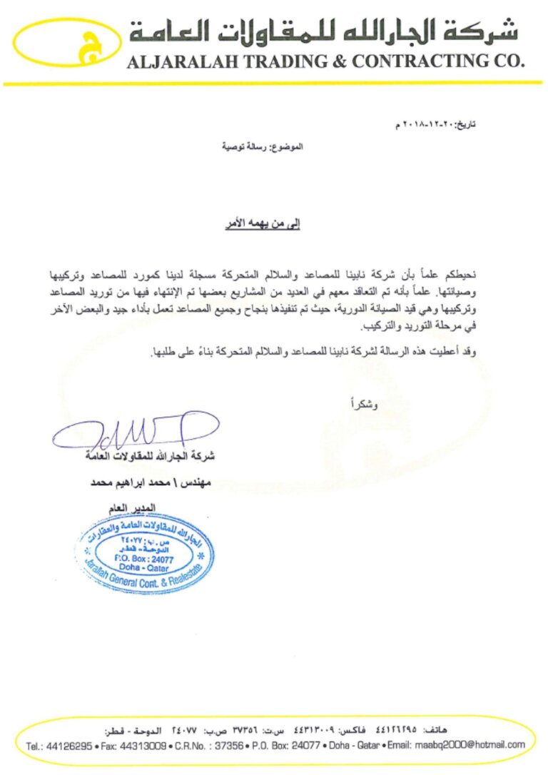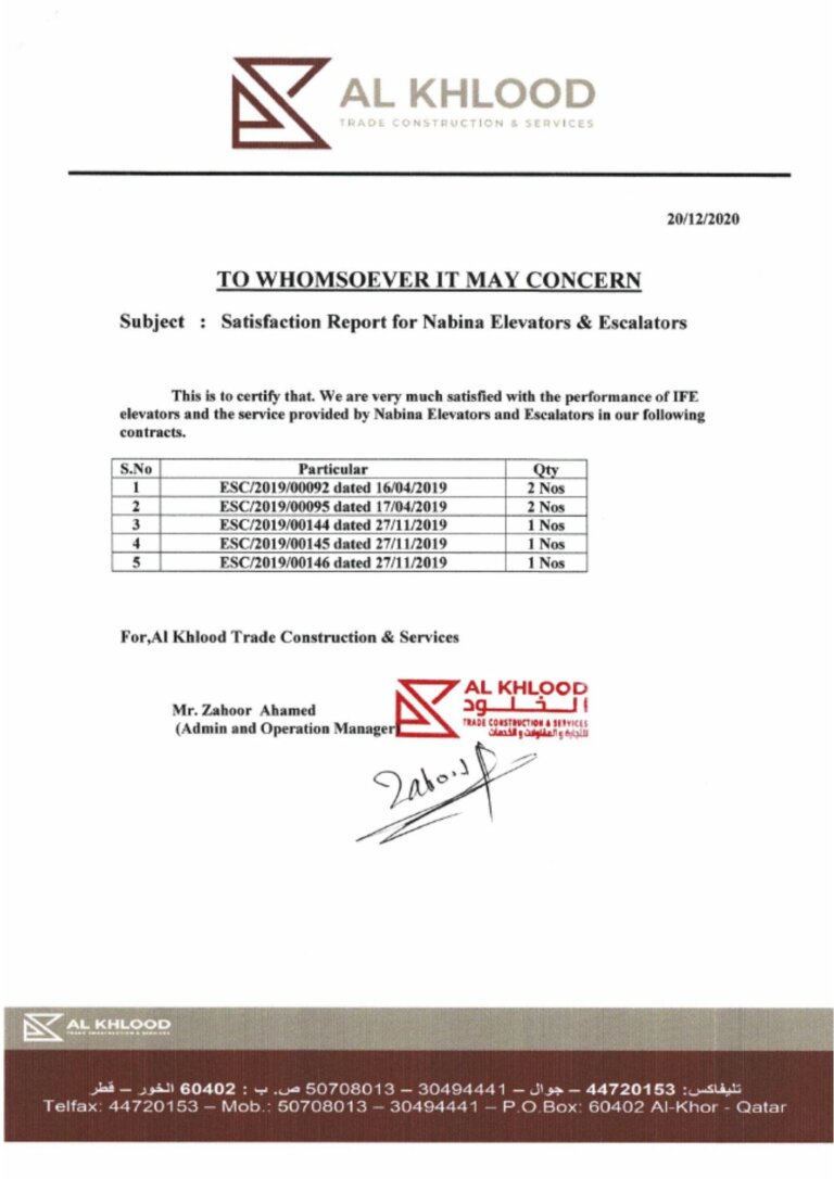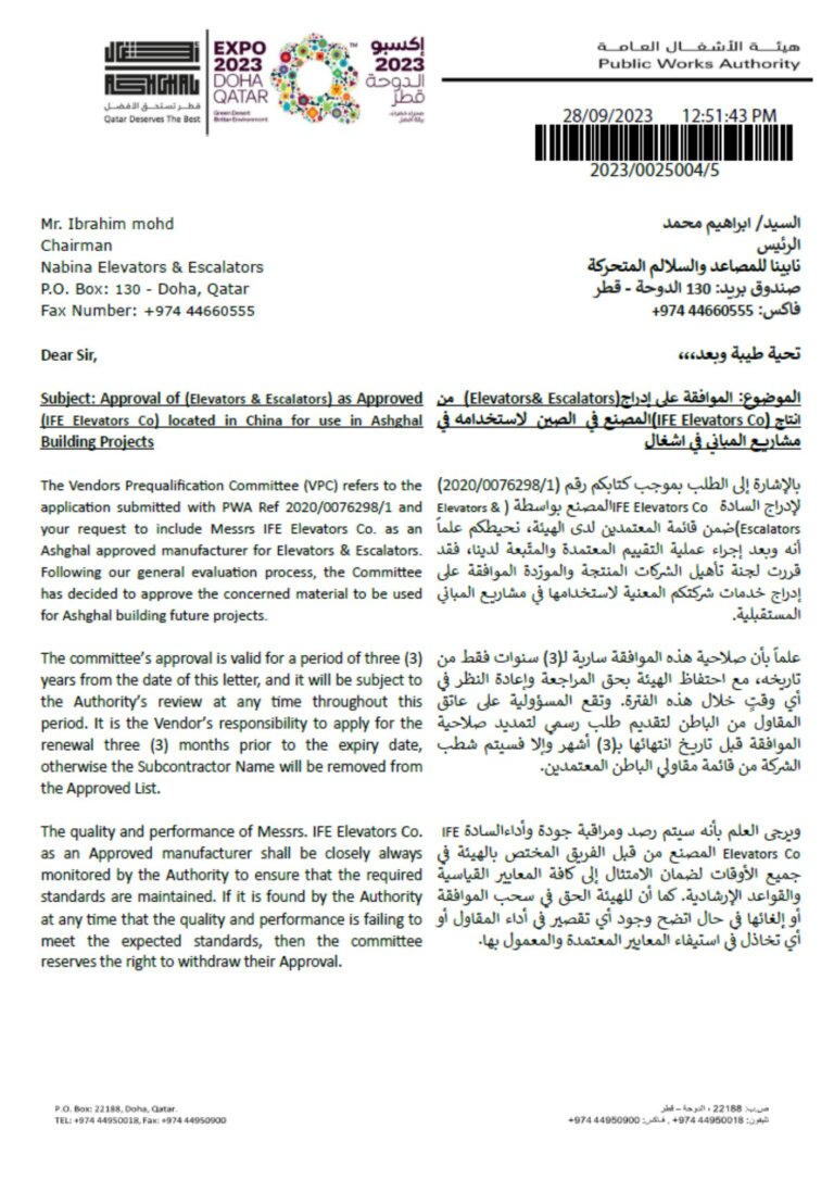 Nabina Elevators and Escalators is the exclusive agent for IFE Elevators, which are approved by the Public Works Authority in Qatar. IFE Elevators, available through Nabina Elevators and Escalators, represent a hallmark of advanced engineering and innovation in vertical transportation.Known for their reliability, efficiency, and cutting-edge technology,